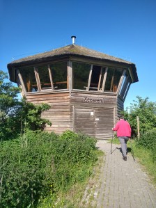 Nadat we de poort van de uitkijkpost hebben opengedaan kunnen wij kiezen uit twee trappen die beiden naar boven gaan. We hebben zicht door de ramen op veel water en vogels en een strakbluawe hemelkoepel boven ons. Een grootschalige verrekijker staat op een ijzeren paal en geeft zicht op verderweg gelegen plekken. We zien lepelaars aan de rand van het water. bij een volgende een beter zicht op deze lepelaars. De zitplaatsen zijn in het midden van de hut gerangschikt op hoogte. We kiezen elk een eigen trap om naar beneden te gaan. We lopen verder naar een Vogelkijkwand. Van hier hebben we beter zicht op de twee lepelaars. Onderweg onmoeten wij meerdere wandelaars die behangen zijn met apparatuur. Een vogelliefhebber moet wat geld uitgeven, maar dan heb je ook wat aan apparatuur. Is die apparatuur een technische middelaar van waarneming tussen natuur en wandelaar? Gaat een vogelaar meer zien of anders zien?