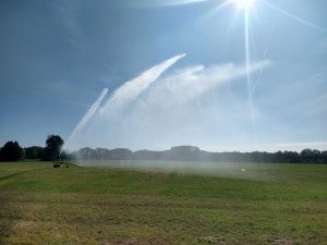 Vlak voordat de Schipbeek onder de A1 doorstroomt ga ik de brug op bij Mensop, waarschijnlijk was hier vroeger een doorwaardbare plaats waar koetsiers/menners hun paarden aanspoorden met ‘men op’, om met versnelde pas door de stroom te gaan en de andere oever te beklimmen. Even verderop loop ik langs de Oude Schipbeek, ook hier tref ik gedichten aan. De route brengt mij door landbouwgebieden, die ondanks de overvloedige regenval van de afgelopen maanden nog wel wat extra water kunnen gebruiken. Het blijft trouwens bij deze enige besproeiing tijdens mijn wandeling. Bij de Mensopweg en de Looweg is er een fraaie omleiding verzorgd die langs een plantenrijk en kleurrijk gebied gaat. Hier heeft iemand aandacht besteed aan kleuren en vormen. Op de Looweg sla ik linksaf en kom op de Paalmansweg. Gelukkig kan ik langs al het werkverkeer dat bezig is met de asfaltlaag heen lopen, ook nog werkverkeer verder op de weg.