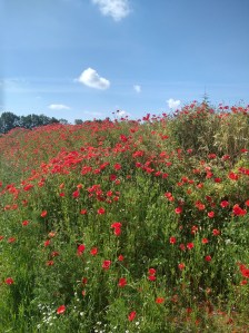 Nadat ik het spoor ben overgetrokken kom ik op de Apenhuizerenkweg. Ik weet niet wat ik van die naam moet denken. Hebben hier apen gehuisd. Of zijn deze dieren juist verhuisd? Onderweg zie ik geen opvallende bewegingen in de bomen of in het sttruikgewas. Even voorbij een klein bosgebied kom ik langs boerderij Willeminks, het zenuwcentrum van de Stichting Rustpunt, het prima initiatief om overal op het platteland rustpunten te creeëren voor wandelaars en fietsers. Dit jaar is een goed jaar voor klaprozen. Onder het applaus van deze rozen loop ik verder. Hier is een voerkuil bedolven onder deze klaprozen. Door het Elferinksbos kom ik dichterbij Bathmen. Over het spoor en naar de kerk, waar op het plein een schoolklas bezig is met een balspel. Ik ben dan al een flink aantal grote oude huizen gepasseerd en monumenten die mij stil laten staan bij de tweede wereldoorlog. Ik kom terug bij het schaduwrijke centrum met restaurant Boode (onverbrekelijk verbonden aan Bathmen).