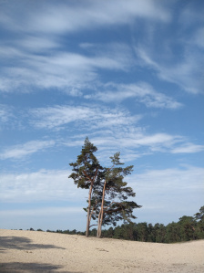 De uitgestrekte bossen filteren langzaam de zonnestralen en de opkomende hitte. Het is stil in de bossen ondanks een enkel vakantieparkje in de buurt. Gisteren zag ik op een kaart van het journaal het getal 34 staan in deze buurt. Misschien is dat ene getal de reden dat er weinig mensen onderweg zijn. Ik heb het rijk alleen. Dan kom ik bij De Sahara, ik ben er ooit overheen gevlogen, nu mag ik er door heen lopen. Ik heb voldoende water bij mij. Voor mij lopen twee jonge mensen, de vrouw draagt een grote rugzak. Bij het begin van de zandvlakte staan voertuigen van de politie, gezien de karren erbij zal het wel de bereden politie zijn. Vroeger was dit zandgebied veel groter, nu wordt er gewerkt om de verkleinde Sahara weer te vergroten. Zo zijn er golfbewegingen in het omgaan met de natuur. Mijn weg gaat nu naar landgoed Junnen. Het is meer van hetzelfde, zandwegen en bossen. Prettig wandelen.