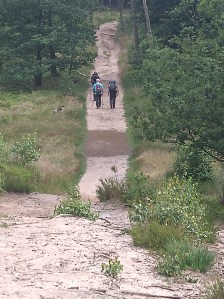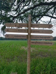 Aan de noordelijke punt van deze route kom ik op het uitzichtpunt van de Holterberg. Het hoogste punt van deze berg ligt op 59.5 meter boven Normaal Amsterdams Peil. Het is opvallend dat zelfs hier Amsterdam als norm wordt gebruikt. Wat ook niet normaal is is het uitzicht vanaf deze berg. Prachtige vergezichten. Om te voorkomen dat de enthousiaste kijker naar beneden stort is er een houten hek geplaatst. Wandelbankjes staan op veilige afstand van het hek. Eén man zit op een bankje, op een in zichzelf ingekeerde wijze. Bij het houten hek staan drie mannen, elk met een flinke rugzak om. Hier loopt de route van het Pieterpad. De mannen besluiten de berg af te dalen over het slingerende en geërodeerde paadje. Ik volg hen op gepaste afstand. We lopen in gelijk tempo, zo blijf ik op die gepaste afstand totdat onze wegen zich scheiden. Zij houden linksaan, ik houd rechtsaan.