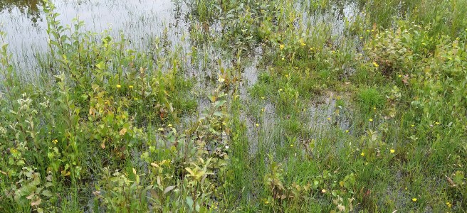 In de pastorietuin passeer ik Maria in de gestalte van Onze Lieve Vrouwe van Lourdes. Deze Maria heeft kenmerken van alomtegenwoordigheid want op mijn wandeling rond Zieuwent kom ik haar vaker tegen. Zo wordt zij ook geëerd als Onze Lieve Vrouwe van Fatima, in een kleine overkapping wacht zij op iemand die een kaarsje aansteekt a 50 eurocenten. Bij de ‘kathedraal’ kom ik al op een Kerkepad. Op vele plaatsen in ons land zijn kerkepaden. Vroeger was er zelfs een omroep die een kerkepad organiseerde, een route langs meerdere kerken in een bepaalde regio. Toen de ruilverkaveling ingreep in het leven van Zieuwent verdwenen de oude kerkepaden. Alles werd strak en recht en optimaal benut. Zieuwent werd opgenomen in de vaart der volkeren. Inmiddels zijn vele kerkepaden weer terug, voor wandelaars en fietsers. Veel veiliger, niet alleen voor kerkgangers, maar ook voor schoolgaande kinderen. Ik kan als wandelaar van buiten ook genieten van deze paden met oude namen. Vanaf de Grobbenweg kom ik in een bijzonder mooi gebied (waar ik ook nog een paar tenten zie staan). Via een buggetje steek ik de Baakse Beek over en ben dan uit een gebied met een bijzondere naam. Die bijzondere naam is: “D’n Leeg’n Könningsstool”, dit natuurterrein is eigendom van de “G.A. van der Lugt Stichting”. Na het bruggetje kom ik in de ‘Olde Moat’, Moat lijkt hier wel een gracht want het is zeer nat hier, vele paden liggen onder water en langs de paden ligt ook voldoende water. Gelukkig heb ik watervaste schoenen zodat ik met droge tenen verder kan komen.