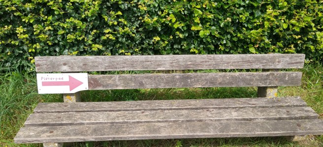 Op het oude en soortenrijke Klokstroeterpad (dat door de buurt gered werd uit de klauwen van de ruilverkaveling) zie ik hem mij tegemoet komen. Petje op. Grote rugzak op. Stok in de hand. We houden stil wanneer we op spreekafstand van elkaar zijn. ‘Het is niet druk vandaag’, is het eerste dat hij zegt, met een zuidelijke tongval. Het blijkt dat hij zijn tijd doorbrengt op het Pieterpad. Ik veroorzaak geen drukte want ik loop het Pieterpad niet. Ik loop hier zo maar een rondje. Ik ga niet verpieteren. Hij is op weg naar een camping die hij bij Braamt hoopt te vinden. Wanneer hij na een afscheidsgroet verder loopt kijk ik achterom en zie dansend aan zijn rugzak een Jacobsschelp. Ik kom meer wandelaars tegen, maar of zij het Pieterpad lopen of de Alternatieve Vierdaagse van Nijmegen of zomaar onderweg zijn met hun kuierlatten weet ik. Zolang mensen maar bewegelijk blijven.