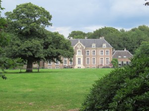 Het landgoed heeft een lange geschiedenis achter de rug. Al in 1379, toen er nog geen netwerkwandelingen bestonden, werd er al een versterkt huis genoteerd in een document. Toen gaf Wolter van Ampsen als een vriendelijke geste Ampsen aan de hertog van Gelre en deze op zijn beurt wilde ook niet onvriendelijk zijn en gaf het in leen terug aan Wolter. Iedereen blij. Het nageslacht van Wolter bleef uit blijdschap op het landgoed wonen, een vrouwelijke telg trouwde met een Duitse edelman (altijd een goede partij in die dagen). In het midden van de 18e eeuw kwam het huis er uit te zien zoals ik heb kunnen aanschouwen van een afstandje. De lanen die ik eerder noemde kwamen pas later op het landgoed.