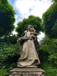 Na een noordelijke beweging komen wij op de ‘In de Broekerweg. Het buurtschap Broek is kort van stof. Met een flinke zwenking over een pad dat alleen toegankelijk is voor wandelaars komen we in het meest noordelijke deel van Schweiberg. Even gaat de route over de asfaltweg alhier. Auto’s en wielrenners stuiven ons voorbij, om over opgevoerde bejaarden maar te zwijgen. Gelukkig mogen wij bij het Höfke een doodlopende straat in, nadat wij kort Maria, die op het kruispunt staat te wachten, hebben gegroet. Zij ziet er vrolijk uit.