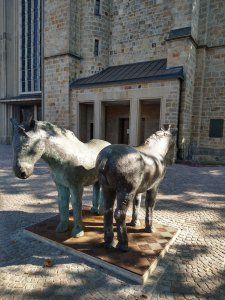 Voor de deuren van de St. Otgerkerk staan twee paarden. Het is marktdag in Stadlohn. Paarden als herinnering aan de paardenmarkt die hier was. Zo herinneren wij ons wat is vergeten. Dreigt iets of iemand te verdwijnen in het verleden dan bij is een standbeeld of monument de uitgelezen wijze om stil te staan bij onze vergeetachtigheid. De twee bronzen paarden van Johannes Brus maakten deel uit van een expositie in 2019. De beide paarden werden in korte tijd zeer populair, met als gevolg dat de paarden werden aangekocht. Vandaag is er meer belangstelling voor de viskraam van D. Menneken uit Gronau, met zijn haring en kibbeling en belegde broodjes. De beide dames in de kar spreken Nederlands met elkaar.