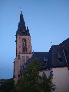 Rest nog één onderwerp: tijdelijke huisvesting. Gisteren lukte het mij niet om onderdak te regelen, alles zit vol. Op een bankje bij een fonteintje ga ik de mogelijkheden nog eens langs. Het levert niets op. Een echtpaar vraagt of ik pelgrim ben, want dit is een pelgrimsstad. Wanneer ik vertel over het Berkelpad daalt de belangstelling zienderogen. Ik loop wat door het centrum met de hoop dat ik onderdak vind of in ieder geval een geschikt bankje om de nacht door te brengen. Ik zie een bordje ‘hotel’ maar dit hotel bestaat niet meer, daarnaast is een boekwinkel, daarnaast en op de hoek een piepklein politiebureau. Aan de overkant van het kruispunt .. weer een bordje ‘hotel‘. Ik ga bemaskerd naar binnen. Er is nog één kamer (gisteren was er nog geen kamer beschikbaar). Mijn kamer kijkt uit op het politiebureau, de boekwinkel en de Ludgerus Dom. Die Ludger was van Friese komaf en zendeling. Hij ging eerst aan de slag in Friesland en later in Deventer (mijn moeder woonde jarenlang in een aanleunwoning van Huize Ludgerus) waar hij de Lebuinuskerk liet bouwen. Later werd hij bisschop te Münster. En nu Billerbeck? Daar stierf hij in 809. Als oud-Deventenaar ben ik zijn Dom binnengegaan.