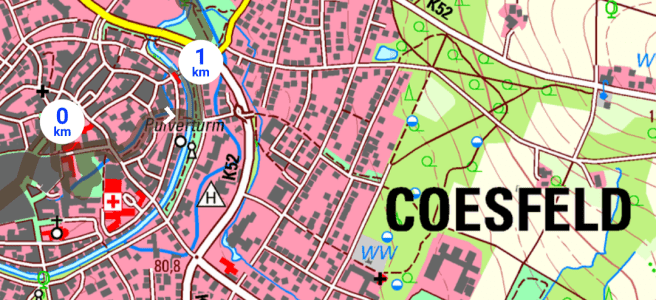 Door de akkerlanden, over asfaltwegen, langs voorbijgaande auto’s, langs boerderijen. Zo maak ik kilometer na kilometer na kilometer. Langs Sirksfeld, een asfaltweg, staat aan de rand van een bos een voormalige basisschool. Nu is er een kampeerterrein en zijn er activiteiten. Nog spannender wordt het wanneer ik het bos inga. Volgens de beschrijving is er een ‘groen-witte metalen slagboom’ waar achter zich een pad bevindt. Eerst worstel ik mij door een vruchtbare kolonie Japanse duizendknoop. Zo kom ik bij de slagboom. Vervolgens is het mijn opdracht om een pad te ontwaren. Ik besluit over te schakelen op mijn GPS want anders zie ik door de duizendknoop het pad niet meer. Na vele meters gemaakt te hebben kom ik op een bijzonder stuk erfgoed. Het is 200 meter van een Grote (en brede) Kruisweg van in totaal 10 kilometer! Deze kruisweg werd ooit begonnen door Bernard van Galen, bisschop van Münster. Bij Groningers was hij bekend als ‘Bommen Berend’. Bernard bezat ook een niet-afgebouwde burcht in Coesfeld. Of het komt door Bernardus of door de Kruisweg of door mijn pauze of door de man die mij vriendelijk toeriep ‘Willkommen’ weet ik niet, maar hier gaat het fout. Ik loop door op de Kruisweg terwijl ik afscheid had moeten nemen. Ik herpak mij en ga op weg naar Coesfeld. Haus Loburg waar ik langs kom heeft een bijzondere historische connectie. Er woont een nazaat van het vorstenhuis Zu Salm-Salm. Ooit was er het roemruchte koninkrijk Salm, van 1802-1811, ten oosten van Winterswijk. Langs de Berkel kom ik Coesfeld binnen en ik kom terecht bij het Marktplein, waar zowaar markt gehouden wordt. Ik loop even rond en ga verder. Van het oude Coesfeld is weinig over sinds de val van een paar geallieerde bommen. Ik vind toch nog een pauzeplek: op een terras aan de Bernard von Galenstrasse.