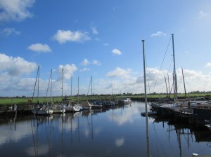 Ik kom uit bij een kleinood in de polder: een oude sluis, een gemaal (uit 1880), een kleine jachthaven en een paar huizen. Eerder stond hier een molen, maar die is in 1880 vervangen door het gemaal. Zowel de sluis als het gemaal zijn rijksmonument. Met de Buitenvaart is de haven verbonden aan de Eem. Een paar mannen zijn aan het werk om het klinkerpad langs de haven te ontdoen van groen. Op een bankje met zicht op de haven en de passerende wolken met flarden blauw trek ik de regenbroek van Wandellief uit. Ik ga er vanuit dat er voorlopig geen regen gaat vallen. Van de haven ga ik over de dijk naar de Eem en langs de Eem totdat ik bij de pont (niet op zondag) over de Eem uitkom. Van hier uit ga ik de polder weer in. Eerst over de asfaltweg en dan neem ik bij de Maarpolder rust. Tegen een hek ga ik zitten. Aan de overzijde van de weg staan een paar schapen en zij zien mij aan. Maar veel bijzonders is er niet te zien. Een man die pauzeert en een boterham eet en een kopje thee drinkt. Ik geef toe: het komt niet schaapachtig over.