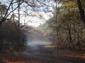 Schuin tegenover deze onderkomens zien wij de restanten van het in vlammen opgegane scoutinggebouw. Overlevingstechnieken zijn zeer gewenst nu het onderkomen in rook is opgegaan. Verderop trekken de laatste nevels op van een veldje. De zonnestralen maken een einde aan wat er was. Op dit punt, vlakbij het paardenbos, komen, hoe kan het, drie paarden aan. Elk paard vergezeld van een amazone. Het drietal passeert ons stapvoets, daarna gaat het tempo omhoog. Zij verdwenen tussen de bomen. Wij komen bij een andere weg, de Hilversumsestraatweg, hier gaan wij langslopen. Deze weg is minder druk dan die andere straatweg. Her en der staan grote gebouwen, zelfs een gebouw dat zich siert met de titel Kasteel. Door de bossen, vergezeld van regen, gaan we naar Oost-Indië, dat minder ver weg ligt dan het lijkt. We zijn nu op het terrein van een ander Kasteel gekomen, Dit is kasteel Groeneveld, dat populair is bij wandelaars en honden, toentallen soorten (honden, bedoel ik) komen voorbij. Wij zitten op een bankje met zonnig uitzicht. De ene na de andere viervoeter komt iemand langs om te proberen een deel van een boterham te verkrijgen, al dan niet zonder onze toestemming. Gelukkig slagen wij er in om de honden niet te spekken. Onze route slingert zich mooi over het landgoed, langs wateren, over bruggetjes, langs het hoofdgebouw en de moestuin en een boerderij (met winkel). Een recht bospad brent ons naar de spoorlijn, waar wij via een voetbrug oversteken. Het bos aan beide zijden van het spoor kleurt bruin, laatste bladeren dwarrelen van de bomen op zoek naar soortgenoten die aan de grond zitten. Langs het spoor en over het spoor trekken wij op naar het station van Baarn en dan is het nog een paar stappen naar de Generaal, die nu vele mensen heeft ontvangen.