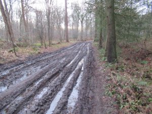 Even na dit tijdstip zie ik de eerste klant bij de oliebollenkraam van Brunselaar staan. De honger slaat vroeg toe bij sommige mensen. Ik baan mij een weg door Nijkerk om bij sportvelden op de Bloemendalseweg uit te komen. De zonsopgang laat zich vandaag van een hele mooi kant zien. De verte kleurt en de silhouetten van kale bomen vormen een doorzichtige versperring aan de einder. Alsmaar rechtdoor (op een slingerende weg) kom ik in Deuverden en de gemeente Putten. Bij een grote manege lopen de fraaie kippen buiten en staan de paarden binnen. Langs boerderij Veldhuizen loop ik langs de Kruishaarse Heide. Langzamerhand wordt het lichter op mijn pad, dat helpt bij het ontwijken van allerhande moddergedeelten. Het is in deze buurt een mooi wisselend landschap over meerdere landgoederen. Heide, bossen, velden, akkers, kleine campings, oude boerderijen. Na ruim 12 kilometer neem ik mijn eerste pauze. Ditmaal heb ik geen boterhammen bij mij, maar pannekoeken, die zijn overgebleven van een baksessie van gisteravond. Een verfrissnde hap en goede vulling van mijn maag. De thee smaakt ook prima. De eerste mountainbikers laten zich zien.