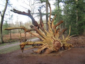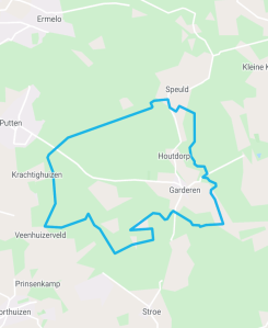 Mijn weg gaat verder over de Solsche Berg en voorts naar het Houtdorperveld. De zon schijnt uitbundig en levert mooie gezichten op over het veld. Meerdere wandelaars zijn in de benen gekomen en lopen van rechts naar links, niet de andere kant uit. Ik loop van zuid naar noord. Het is een mooi gebied. Ter hoogte van Speuld verlaat ik het Houtdorperveld. Wanneer ik 11 kilometer op de teller heb zie ik een bankje aan de rand van Speuld. Hier neem ik mijn pauze. Een enkele auto komt voorbij. Het is hier rustig. Na mijn pauze ga ik de Sprielderweg op. Even verderop sla ik twee maal af en loop een lange, lange weg af, onverhard, bosrijk, ten zuiden van Drie. Eerst door het Speulderbosch (en vlakbij het Solsche Gat) en dan door het Sprielderbosch. Vlakbij Putten steek ik de weg tussen Putten en Koudhoorn over. In de buurt van Krachtighuizen zie ik in de bossen enkele grote woningen op ruime percelen. Vlak voordat ik bij Veenhuizerveld aankom sla ik af naar het oosten. Aan het begin van een zandweg die naar Bato’s Erf gaat, zie ik een fraaie boomstronk langs het pad. Een mooie plek voor een pauze. Ik zit nog maar net of ik hoor een paard op een tiental meters van mij. De jonge amazone probeert het paard onder controle te krijgen. Dat lukt maar net voordat zij vlak langs mij heen rijdt. In dit gebied van het Huinerveld is een hoge paarddichtheid. Eén enkele man op een paard, maar het zijn voornamelijk amazones die hier rond rijden. Bato’s Erf is een grote boerderij in het midden van uitgestrekte bossen. De Pauwenhof is een buurman, een paar bomen verder. Het is een conferentiecentrum van christelijke signatuur. De Maalweg brengt mij door een klein heidegebied, er is nog een water (het Watersemeer) maar dat is te ver weg om te zien. Ik kom terecht op de Oude Nijkerkerweg, die ik oploop in westelijke richting. In de driehoek met de Lage Boeschoterweg staan vele grote huizen, sommigen van recente datum. Een Jaguar passeert mij, terwijl je hier ook goed kunt lopen. Met hulp van Bergsham en Het Gat van Zus kom ik terug bij de parkeerplaats van de Zandsculpturen, maar ook van houten sculpturen.
