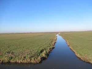 Nu kleurt het hemelsblauw de sloten die door de polder lopen, op weg naar wat ooit de Zuiderzee was. Een enkele auto komt voorbij, een scholier is onderweg naar Nijkerk. Een gans vliegt op. Water stroomt traag.