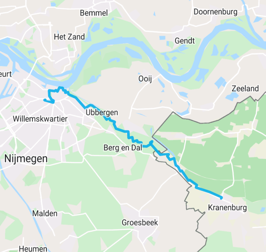 En toen kwam corona en ik besloot voorlopig niet meer gebruik te maken van het openbaar vervoer. Het Pad bleef op de plank liggen, maand na maand. De bedoeling was om de laatste etappe te gaan lopen en dan in Kleve (het eindpunt) Wandellief te ontmoeten. Tôen kwam recent Wandellief op de brilliante gedachte om in twee dagen van Nijmegen naar Kleve te wandelen, met halverwege in Kranenburg een overnachting. Het is nog niet eerder vertoond dat wij op deze manier beginnen aan een tweedaagse tocht.