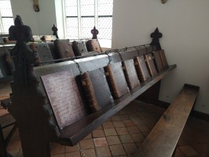 Terug naar de kerk (eigendom van de Stichting Oude Gelderse Kerken) waar wij een rondleiding krijgen van Louis die ons boeiend onderhoudt met zijn verhalen. Opvallend was dat in oude tijden het kerkgebouw multifunctioneel was, allerlei bijeenkomsten vonden hier plaats, het was een ontmoetingscentrum, ook door de nauwe banden tussen kerk en overheid. Toen steden als Zutphen en Deventer bloeiden was het westen van ons land nog woest en ledig. Sinds een paar jaar worden hier niet meer elke zondag kerkdiensten gehouden. En dan .. neemt Louis ons mee naar een ossenrode deur waarop staat Geen toegang, maar daar trekt Louis zich niets van aan. Hij steekt een sleutel in het slot en deur zwaait open. Achter deze deur ligt geschiedenis opgestapeld. Dit is de Librije van Zutphen. Hier kwamen de kanunniken van Zutphen om te studeren. Hier lagen de gedrukte boeken aan de ketting. Eeuwen lang is hier gestudeerd en gelezen. In de priode 1561-1564 werd deze lees- en studiezaal gebouwd. Er liggen belangrijke boeken, zoals een eerste druk van Copernicus over de hemellichamen, een eerste druk van een boek van Desiderius Erasmus en een eerste druk van de Statenvertaling van de bijbel. Tussen twee lectrijnen (de oorspronkelijke) staat een kaal bankje. Studeren is hard werken. Geen luie stoel maar een kaal bankje. Momenteel is deze kettingbibliotheek de enige in Nederland en één van de drie in de wereld. Na deze tocht in de boekengeschiedenis gaan we met onze gids Ben nog verder door de kerk. We bekijken een herdenkingsteen voor Willem Baudartius die predikant in Zutphen en tevens was hij één van de vertalers van de Statenvertaling van de bijbel.