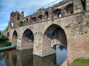 Na een minibieb bekeken te hebben gaan we staan op een brug (van de Dieserstraat) van waar af wij prachtig zicht hebben op de Berkelpoort. En niet zo maar de Berkelpoort. Of onze gids dit geregeld heeft weet ik niet, maar op de poort staan ballerina’s in wit of rood gekleed.