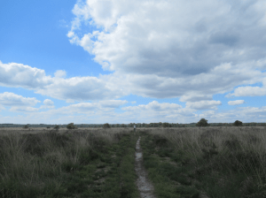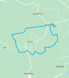 Wij zullen zeker niet voeren want de mondvoorraad die wij bij ons hebben nuttigen wij zelf op een bankje met uitzicht over het Speulderveld en het Houtdorperveld. Twee velden in één blik. Ouderen op nieuwe fietsen komen voorbij gesneld. Zo oud en nog zo veel haast. Na de pauze verlaten wij de rechte weg met een enkele boom en slaan linksaf over een smal pad door de heide. In de verte roept een koekkoek. Laag bij de grond maken krekels (?) veel lawaai. Voor je rust moet je hier niet wandelen. Over de Koningsweg geraken wij tot de drukke N302 die wij in goede gezondheid kunnen oversteken. Door het oversteken zijn wij terug op landgoed Staverden. Hier komen wij bij een kleine cluster van woningen. Een vrij nieuwe woning staat te koop, een andere heeft een vakantiehuisje op het erf, een derde heeft een Bed en een Ontbijt. We steken in één keer zowel de Hierdensche Beek als de Staverdensche Beek over. Misschien wel onder deze brug vloeien beide wateren in elkaar over. Deze beek gaat ook nog schuil onder de naam Leuvenumsche Beek. Wij lopen trouwens hier nog steeds over de Koningsweg, die zich niet heeft laten ophouden door de N-weg. Maar ook aan een Koningsweg komt een einde en wij gaan naar het noorden over de geasfalteerde Uddelermeerweg. Vlak voor een huis met wijngaard en een man die gemotoriseerd de weelderig groeiende en bloeiende berm kort en klein maakt slaan wij linksaf. Het houdt maar niet op, we steken wederom de Staverdensche Beek over. Langs de oude boerderij de Oldhof gaan wij verder en komen in de bewoonde wereld van Staverden. Bij het bezoekerscentrum van GLK gaan wij naar binnen en kopen enkele zaken, waaronder twee magnums die wij buiten in het zonnetje op een bankje op eten/likken. Langs de oude molen en door de fraaie tuin van het Huis gaan wij verder. Een mooie wandeling zit er op.