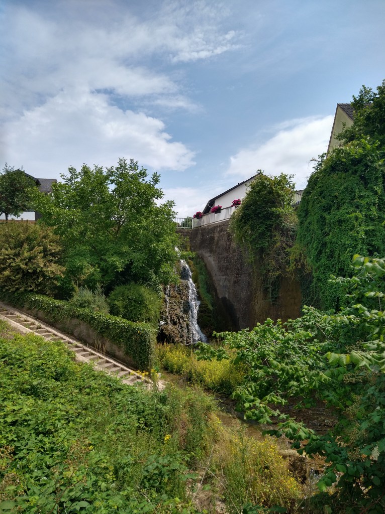 Wij komen in de buurt van Wincheringen, waar een eerzaam slot staat. Wij gaan echter een route tussen het dorp en de rivier langs. Wij passeren de twee dames die inmiddels niet één, maar twee bankjes met een tafel hebben gevonden. We hebben steeds vaker zicht op de traag stromende rivier, waar een enkele rijnaak richting Frankrijk gaat. We ontwaren een schuilhut annex uitzichtpunt. Daar genieten we van schaduw, koud water en het uitzicht. Plots komt een wandelaar langs. Het is de bankdeler. Na uitwisseling van wederzijdse gedachten gaat hij verder. Het dorpje Rehlingen biedt onderdak aan een kerk, verder is er voornamelijk stilte in het kleine dorp. Even ten noorden van het dorp is een kleine kapel met begraafplaats. Wij volgen het steile voetpad om op hoogte te komen. Van de andere kant komt een auto met vrouw aangereden en zij stuurt naar de parkeerplaats tegenover de begraafplaats. Even verderop nemen wij plaats op een bankje dat gericht is op een wijngaard. Brood en thee en water schieten ons te hulp. Nog even en wij passeren de Kölliger Höhe (286 meter). Dan komen wij in een bos met hoogteverschillen, niet alleen van de bomen, maar ook op de grond. In het bos ontwaren wij niet alleen een bijzondere rotsformatie, maar ook twee mensen die met maaier en hark het pad voor onze voeten begaanbaar maken.