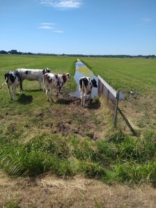 Voor mij stopt een trekker half op het weggetje. De bestuurder stapt uit loopt naar een hek dat de weg naar De Slaag blokkert. Hij doet het hek open, loopt terug naar zijn trekker en rijdt het land op. De twee maaiers worden neergeklapt en hij gaat rijden. Even verderop staan vier koeien bij een sloot. Zij kijken naar het water waar gele bloemen in bloeien. Groen. Geel. Blauw. Polderland. Nederland.