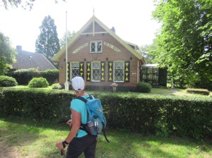 Gesteund door Wandellief ga ik verder, terug op de oprijlaan, dan langs de minimalistische gracht met een groen voorkomen. Aan de andere zijde een moestuin en een theetuin en een landgoedwinkel. Pijlen wijzen naar links. Onder het bordje hangt een volgend bordje. ‘Gesloten‘ luidt de heldere tekst. Misschien is het nog te vroeg. Wij volgen de gracht om het Huis Verwolde en komen uit op de Jonker Emilelaan, die wij kortstondig volgen. Wij zwerven door bos en langs veld, passeren ’t Jagershuis‘ waar ooit de jachtopziener annex boswachter zal hebben gewoond. Nu woont barones van der Borch van Verwolde hier. De huizen die wij tegenkomen zien er goed uit, mooi in de kleuren van het voorgeslacht en met de naam van het huis en het jaartal op de voorgevel. Na drie kilometer op onze wandeling raak ik even het spoor bijster. De route gaat tussen twee boerderijen door en dan volg ik het spoor door het bos. Dan blijkt mij dat ik de lus die hier begint op deze manier oversla. We gaan het bos weer uit, aan dezelfde kant waar wij het bos zijn ingegaan. Terug bij af gaan wij linksaf Holmershuizen op. Voordat wij bij boerderij Aseler komen slaan wij rechtsaf een laantje in. Wij zijn nu op Landgoed Kranengoor, een particulier landgoed. Sommigen delen van het landgoed zijn niet toegankelijk. De bordjes zijn duidelijk. Dit terrein hoorde vroeger bij landgoed Verwolde. Het is hier goed toeven op deze zonnige dag. De zon zoekt een toegangsweg tussen de bladerdaken door. Wij wandelen door Kranengoor en komen bij het Blankenbergsche Veld. In dit gebied is de eigenaar geen liefhebber van wandelbankjes. Bankjes vinden we pas, en dan in overvloed, wanneer we de lus hebben beëindigd en weer bij de twee boerderijen zijn. Tijd voor een pauze met koel water en een boterham en enkele schijfjes komkommer.