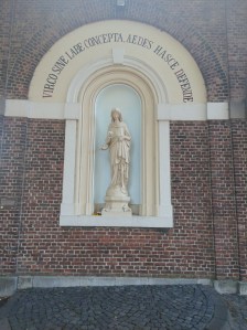 Vlak na kasteel Rimburg (zie de foto van de voordeur bovenaan) sla ik linksaf. Vlak voor de brug over de Wurm sla ik rechtsaf, de Zwei-Schlösser-Allee op. De laan is heel smal en minder indrukwekkend dan de naam. Na een paar meter is het pad gebarricadeerd, duidelijk is aangegeven dat ook voetgangers niet ver mogen. Een blik op de kaart wijst mij een eenvoudige omweg. Ik steek de brug (met twee schildpadden) over en plots realiseer ik mij dat Wandellief en ik hier hebben gefietst. Ik stilte denk ik aan haar. Aan de andere zijde van de brug is het Nederlandse Rimburg, het kasteel is Duits. In het centrum sla ik rechtsaf en wandel naar Übach-Palenberg. Aan het begin van het Duitse dorp staat een grote Lidl, hier haal ik een toevoeging op mijn mondvoorraad. Ik steek maar weer eens een brug over en met een neerwaartse draai kom ik langs de rivier op de route.