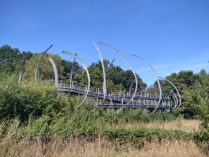 Net voorbij het recreatiegebied van Übach-Palenberg is het pad geblokkeerd. Een briefje vermeldt dat dit ook geld voor fietsers en wandelaars. De omleiding wijst naar rechts. Ik kijk op de route en zie dat ik even verderop de route weer kan oppakken. Ik wandel naar rechts, bij de spoorlijn naar links, dan weer naar links, maar het bord ‘omleiding’ wijst naar rechts. Wanneer ik die kant uitga moet ik een zeer lange omweg maken. Toch maar naar links waar al snel de hele breedte van de weg gebarricadeerd is. Ik zie een opening en in de verte twee mannen aan het werk op de brug. Ik loop als een echte wandelaar met mijn zwaaiende stok. Eén man ziet mij aankomen en gebaart dat ik niet verder mag. Ik raak aan de praat met hem en vraag of de loopbrug even verderop toegankelijk is. Dat weet hij niet en hij raadpleegt zijn collega. Die is van mening dat die brug is afgesloten. “Waar gaat u naar toe?” vraagt hij. Een eerste scheur in het bolwerk. Ik laat hem mijn route zien die aan de andere kant van de brug verder gaat. “Oh, dan komt u langs de Klangbrücke.” Dat komt mij bekend voor. “Wanneer u hier en daar en zus en zo verder loopt dan slaat u rechts af en dan komt u bij de Klangbrücke. Ik bedank beide mannen hartelijk in mijn beste Duits. Aan de overkant van de Wurm vind ik een mogelijkheid om half via een voortuingrens de barricade te passeren.