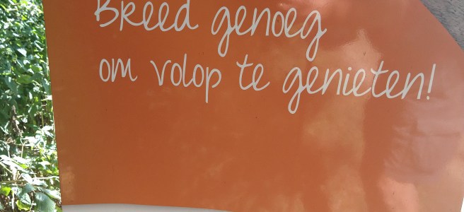 Ik ga door en kom weer eens in Nederland. De eerste bank die ik zie is onbezet, in de schaduw en op tijd voor mij. Ik neem de tijd. Er komen meer wandelaars langs. Ik raak aan de praat met een jonge vrouw die in één keer de hele route van het Pieterpad loopt. Zij heeft een tent bij zich. Soms zet zij de tent op op een camping, soms in het wild, maar meestal in de tuin van particulieren. Gisteren is zij haar slaapmatje verloren, maar op het tentadres kon zij een matje van de particulieren gebruiken. Hoever zij vandaag gaat weet zij niet. De eerste dagen liep zij ongeveer 20 km per dag. Nu zit zij op 30 km per dag. We wensen elkaar een goede wandeling toe. Even later stopt een jongeman op de fiets. Hij biedt mij water aan. Altijd welkom. Bij fietst een deel van het Pieterpad van zuid naar noord. Hij is dichtbij de camping in Pey en hij heeft al dit water niet meer nodig. Hij fietst met de zon in de rug.