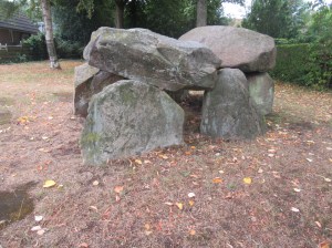 Ik steek het Noord-Willemskanaal over, waar boten vastgeketend aan de oever liggen. Stilstand is verder op het water ook waar te nemen. Zelfs op de A28 valt het mee met de drukte. De Dorpsstraat van Tynaarlo nodigt mij uit om binnen te treden. Een man komt bij de bakkerswinkel ’t Brughoes (een winkel en meer) vandaan met twee broden in zijn hand. Een vrouw stapt van haar fiets af en wacht voor de etalage op haar beurt. Geldt hier de regel van een maximum aantal mensen in de winkel? Vanwege corona? Vanwege het geringe vloeroppervlak van de bakkerswinkel? In het dorp kom ik nog een andere bijzonderheid tegen. Annemiek laat mij middels een bord weten dat zij een ‘gastouderopvang‘ heeft. Dat is bijzonder maar ook heel noodzakelijk. Veel gastouders hebben het druk. Ze worden de hele dag omringd door kinderen die druk zijn, gillen, weigeren te eten, weigeren te slapen, brutaal zijn. Deze gastouders hebben het niet gemakkelijk. Nu heeft Annemiek een ‘gastouderopvang’. Ik stel mij voor dat gastouders hier in het rustige Tynaarlo even op adem kunnen komen, een handmassage krijgen, een warm broodje uit ’t Brughoes, de gelegenheid om zich uit te leven op een boksbal, om een tekening te maken, gevolgd door een indringend gesprek. Dan terug naar de rauwe werkelijkheid van de ‘kinderopvang’. De bijzondere vondsten in Tynaarlo zitten er nog niet op. Aan de oostkant van het dorp zie ik het plotseling, zonder enige waarschuwing. Vanuit mijn linkerooghoek zie ik een stapeling van stenen. Het is een hunebed. Niet zo maar een hunebed. Het is D6. Nu doet mij deze aanduiding eerder denken aan de D6 pupillen van de voetbalvereniging FC Hunebed, dan aan een stapeling van fors uitgevallen stenen. Dit hunebed is nooit gerestaureerd. Het hunebed, met in totaal tien stenen, dateert uit de periode 3400-3100 voor Christus. Omwonenden en Staatsbosbeheer (Staatsteenbeheer?) zorgen voor het dagelijks onderhoud. Er is altijd wel iemand die er met de stoffer over heen wil gaan. Zeg Drenthe en je zegt niet alleen Bartje (ik zag zijn standbeeld vanuit de bus), maar ook hunebed.