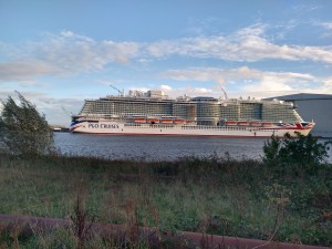 Het is een cruiseschip dat in de staat van wording verkeerd. De constructie torent boven alles uit, nou nee, niet boven de loods. De ‘loods’ is het grootste overdekte droogdok ter wereld. Gewoon in het havengebied van Papenburg, veilig achter zeesluizen. Hoog boven op het schip zie ik twee personen. Zouden zij getest zijn op hoogtevrees?