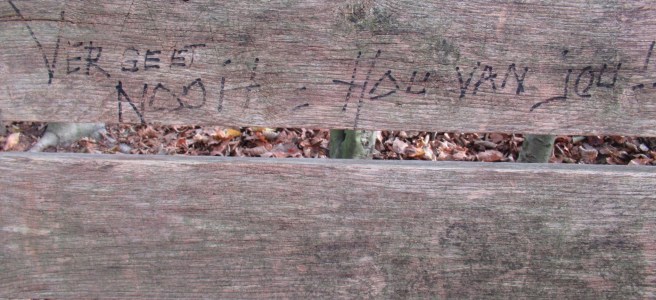 Wandellief en ik beginnen aan onze laatste Kasteelwandeling uit de gids van Gegarandeerd Onregelmatig. Nu zijn onze wandelingen ook onregelmatig qua onderlinge tijdsspanne. Het is al vele weken dat wij onze voorlaatste Kasteelwandeling hebben gelopen. Er stond aanvankelijk een stadswandeling in Utrecht op ons programma, maar Wandellief gaf toch de voorkeur aan een lange wandeling over landgoederen, door beukenlanen, over dekens van bladeren, zonnestralen op vallend gekleurd blad. Wie ben ik om dan te zeggen: Kom laten wij de binnenstad van Utrecht onveilig maken! Dat kan altijd nog op een regenachtige dag met een snijdende wind. Het eerste deel van onze wandeling is druk bezet met honden die zich voortbewegen op zeer verscheidene wijzen. Er zijn honden bij waarvan ik verwacht dat die elk moment in elkaar kunnen zakken. Een vrouw op de fiets vergezelt een blaffende hond die vol enthousiasme van voor naar achteren rent. Een jonge vrouw heeft een hondje bij zich van 10 weken. Het beestje, een echte Jack Russell, komt nauwelijks boven het bladerdek uit. Hij staat met zijn voorpootjes op de linkerschoen van zijn bazin om enig zicht te hebben. Wij steken een asfaltweg over en komen in het leefgebied van de Schaarsbergenaars. Hier ligt een dik bladerdek. Een man met hark en bezem en bats komt ons tegemoet. Hij gaat toch niet al deze paden ontdoen van gekleurde bladeren? Wanneer ik vgoor de zekerheid nog even achterom kijk zie ik hem heel voorzichtig van het pad afgaan. Schaarsbergen herbergt raadselen. Even verderop slaan wij een hoek om, daar ligt een vrouw in het bladerdek. Haar tas staat tegen een boom. Slechts haar camera met lange lens doet vermoeden dat zij aan het werk is. Door de herfstlaan komt een gezelschap van zes personen hand-in-hand langzaam op de camera af. Opa en oma, twee van de volgende generatie en dan twee kleinkinderen. Komt er een huwelijksfeest aan? Aan de rand van Bakenberg (niet te verwarren met de Bakenberg tussen Apeldoorn en Hoenderloo) steken wij over bij de warme broodbakker en gebaktotstandbrenger. Wij kijken even voor het raam, snuiven de geuren op en geven dan ruimte aan een drietal wandelaars dat naar binnen wil. In Bakenberg wonen ruim duizend mensen, maar wij hebben hen niet allemaal gezien. Wij gaan het Lage Erf op en dan is de situatie veranderd. Het wandelpad is opgeschoven naar rechts, langs een serie gloednieuwe huizen. Gelukkig raken wij niet veel uit de koers. Nog even en dan zijn wij in de buurt van Landgoed Groot Warnsborn. Wij gaan niet langs de voorkant, maar langs de achterkant, waar wij kennismaken met het Klompenpad Schaarsbergenpad. Een bruggetje over en dan verder langs een groep prachtige Lakenvelders. Even verderop staat een bankje, in de zon. Wanneer wij het bankje zien, zitten er nog mensen op. Maar wanneer wij naderen, maken zij zich haastig uit de voeten. Een heerlijke plek, in de zon, met een enkele voorbijganger, en een bruine bol met kas in de hand.