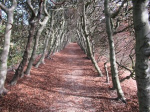 Op dit landgoed lopen wij over fraaie paden. Wij steken de drukke N224 over en komen op een ander landgoed. Ditmaal is het Boschlust. Voordat wij de Schelmseweg oversteken passeren wij een houten theekoepel. Wij hebben zelf thee bij ons dus er is geen noodzaak om aan te bellen . Er staat een auto voor de deur en er wordt iemand binnenshuis waargenomen. Het zou wat zijn wanneer iedere passant hier even aanklopt om een glas thee (naar keuze). Van Boschlust (of is het Landgoed Lichtenbeek?) stappen wij over op Landgoed Mariëndaal, alsof het niets is. Zouden in oude tijden de Boschlustbewoners de Mariëndaalbewoners hebben uitgenodigd voor een kopje thee tijdens de middaguren, wanneer het personeel werkte op het land? Na een steile afdaling maken we een afslag en dan aan onze rechterhand ééj van de ingangen van de “Groene Bedstee”. Waarom deze 300 meter lange berceau een bedstee wordt genoemd is mij niet duidelijk. Ik dacht dat het de bedoeling was om in de schaduw te kunnen wandelen, zodat de tere bleke huid niet zou worden aangetast door de zonnenschijn. Blijkbaar werden hier ook andere activiteiten uitgeoefend. De berceau is al meer dan 150 jaar oud en trekt nog steeds veel wandelaars naar buiten en dan weer naar binnen. Nu komt de zon door het gevallen bladerdek.