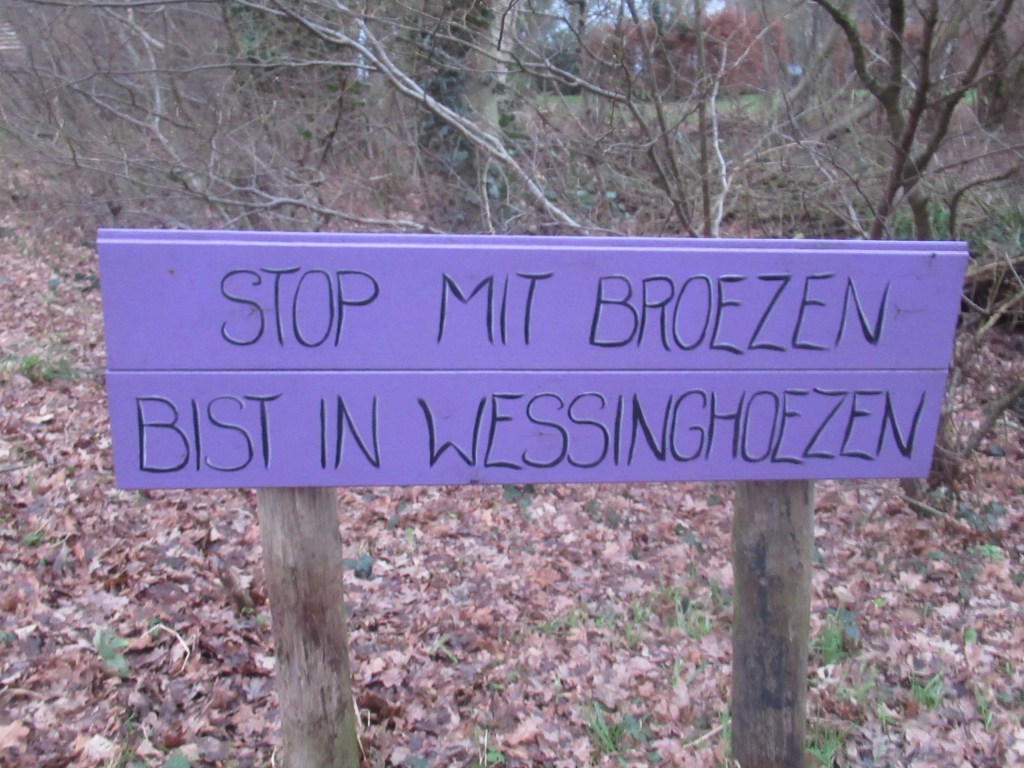 Dan hoor ik een stem achter mij. Het is mijn gastvrouw die mij roept terwijl zij in elke hand een thermosfles heeft. Ik ben blijkbaar nog niet helemaal wakker. De flessen gaan in de buitenvakken van mijn rugzak en ik ben dan nu helemaal gereed om op pad te gaan. Ik steek de Westerwoldsche (of is het hier al de Ruiten?) Aa over en sla af naar links, na een 100 meter kan ik de wildernis van Wedde al in gaan. Mijn pad zal een tijdje de slingerende Aa volgen, maar al gauw stuit ik op een probleem. De Aa staat op deze plek in open verbinding met een sloot, verdiept in het landschap. In andere tijden zal je hier wel met droge voeten doorheen kunnen. Ik loop nog even langs de sloot, maar een mogelijkheid om deze rietsloot te doorkruisen zie ik niet. Dan maar terug naar de Kempkebosweg. Op de terugweg word ik aangesproken door een dame op een fiets, terwijl ik haar net opmerkzaam wilde maken op de sloot met toebehoren. Zij vraagt naar haar twee hondjes die zij kwijt is. Zij erkent dat het niet de slimsten onder de honden zijn en hoopt dat de beestjes de weg naar huis terug kunnen vinden. Honden en vrouw wonen nog maar een paar maanden in Wedde. Ik hoop voor alle drie dat zij de weg naar huis kunnen vinden.