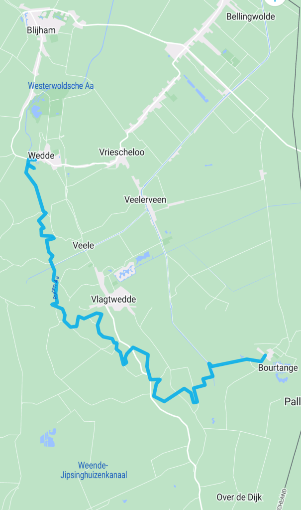 In de gang wachten mijn modderschoenen en ik haal de natte proppen Volkskrant uit mijn schoenen. Links aan. Rechts aan. De rugzak om. Routeboekje in mijn linkerhand. Mijn gastvrouw schuift het gordijn voor de deur weg en opent de oude deur. Ik stap naar buiten en wij nemen afscheid. De deur valt achter mij dicht en ik loop de tuin uit. Op het pad dat ook naar Huis te Wedde leidt schakel ik mijn apparatuur in. Mijn route wordt opgenomen. De route heb ik digitaal beschikbaar. Ik kan gaan.