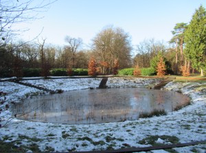 En dan .. na bijna 6 kilometer op pad zie ik ineens een plas, als een as met spaken in het bos liggen. Liever gezegd en geschreven een vijver, want het is duidelijk dat een aangelegd deel van Landgoed Beerschoten is. Flarden ijs, bevroren sneeuw en meerdere zichtlanen. Een verstilde plek. Driekwart draai om de vijver heen en dan een smalle laan in waar ik meerdere tegenliggers heb. De laanstructuur strekt zich verder uit totdat ik bijna bij een grote weide ben. Een restant van een sneeuwpop staart ijzig in de verte. Aan de boomrand wordt gezaagd en gesleept. Ik steek via een klassieke brug een voor mij naamloos water over. Over de Visserssteeg nader ik het Paviljoen van Beerschoten. Het paviljoen is niet dicht, maar slechts open voor bouwvakkers die aan de slag zijn en die hopen in het voorjaar van het jaar 2023 klaar te zijn met hun werkzaamheden. De route voert mij door een prachtige beeldentuin, waar werk van Jits Bakker te zien is. Speels en verrassend en herkenbaar. Zeer de moeite waard op hier aandachtig rond te lopen. Naast het paviljoen voert de route mij door een berceau. Aan de andere zijde zitten vrijwilligers te neder om een warme drank naar binnen te werken. Het terrein bij het Paviljoen wordt opgeknapt. Vrijwilligers zijn vaak nodig om hierbij te helpen. Ik schaar mij onder de vrijwillige wandelaars. Een vrijwillige wandelaar die inmiddels in het zonnetje loopt. Het dreigt zelfs warm te worden.