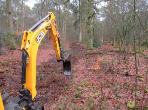 Ik verlaat het terrein van de grillige eiken en kom bij het gebied van de Wolfhezerheide. Tegenover een met witrodelintren versierde brug is een pad afgesloten. Ik heb nog meegemaakt dat je over dit pad mocht wandelen en dat heb ik dan ook gedaan. Nu is het afgesloten om de diertjes en de plantjes en de struikjes en de heide rust te geven. Wanneer ik rond deze heide wandel kom ik meerdere wandelaars tegen, die in alle rust zich uit de voeten maken. De routebeschrijving blinkt niet uit in helderheid. Gelukkig heb ik een goede kaart op mijn mobieltje. Op meerdere plekken kom ik afgezette paden tegen. De paden zijn inmiddels niet meer als paden te herkennen. Ik kom uit bij de Wolfhezerweg die ik recht oversteek. Vlakbij de parkeerplaats van het eerder genoemde hotel tref ik de oude boom die op de grond ligt. Het is een duizendjarige den, althans uit toeristische oogpunt. De werkelijkheid is minder eeuwig. Voordat Hotel Fletcher er stond en nog eerder dan de naam Hotel Wolfheze was hier al; een uitspanning. Dit was één van de plekken waar de schilders elkaar ontmoeten na een dag van hard kwasten. Vlakbij de oude gevallen boom staat een busje van een bedrijf voor landschapsbeheer en bosbeheer. Even verderop zit een man op een machine en hij laat een pad verdwijenen door zijn grijper. Weer een pad minder. Even verder staat een trekker met aanhanger, op de trekker, van het merk Fendt, staat de naam van het bedrijf. Johan Rap, waarschijnlijk heb ik zojuist Rap gesproken en even daarvoor zijn maat. Nog even onder de Wolfhezerweg door en dan naarliks op weg naar de parkeerplaats. Het is inmiddels opgehouden met miezeren.