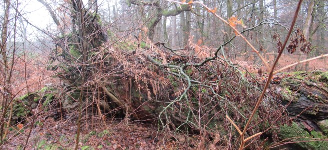 Ik verlaat het terrein van de grillige eiken en kom bij het gebied van de Wolfhezerheide. Tegenover een met witrodelintren versierde brug is een pad afgesloten. Ik heb nog meegemaakt dat je over dit pad mocht wandelen en dat heb ik dan ook gedaan. Nu is het afgesloten om de diertjes en de plantjes en de struikjes en de heide rust te geven. Wanneer ik rond deze heide wandel kom ik meerdere wandelaars tegen, die in alle rust zich uit de voeten maken. De routebeschrijving blinkt niet uit in helderheid. Gelukkig heb ik een goede kaart op mijn mobieltje. Op meerdere plekken kom ik afgezette paden tegen. De paden zijn inmiddels niet meer als paden te herkennen. Ik kom uit bij de Wolfhezerweg die ik recht oversteek. Vlakbij de parkeerplaats van het eerder genoemde hotel tref ik de oude boom die op de grond ligt. Het is een duizendjarige den, althans uit toeristische oogpunt. De werkelijkheid is minder eeuwig. Voordat Hotel Fletcher er stond en nog eerder dan de naam Hotel Wolfheze was hier al; een uitspanning. Dit was één van de plekken waar de schilders elkaar ontmoeten na een dag van hard kwasten. Vlakbij de oude gevallen boom staat een busje van een bedrijf voor landschapsbeheer en bosbeheer. Even verderop zit een man op een machine en hij laat een pad verdwijenen door zijn grijper. Weer een pad minder. Even verder staat een trekker met aanhanger, op de trekker, van het merk Fendt, staat de naam van het bedrijf. Johan Rap, waarschijnlijk heb ik zojuist Rap gesproken en even daarvoor zijn maat. Nog even onder de Wolfhezerweg door en dan naarliks op weg naar de parkeerplaats. Het is inmiddels opgehouden met miezeren.
