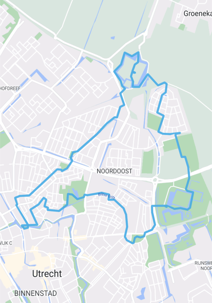 Langs een spoorlijn, rond Utrecht zijn vele lijnen van het spoor, zijn mannen bezig om kabels te leggen in de modder. Eén man houdt de kabels omhoog, een andere man legt eerst een kabelgoot onder de kabels en vervolgens maakt hij de cirkel rond door aan de bovenzijde ook een kabelgoot te plaatsen en deze beide goten aan elkaar vast te maken. Onder een viaduct besluit ik om mijn regenbroek aan te trekken. Mijn wandelbroek is voldoende nat geworden. Even later blijkt dat het warmer is geworden rond mijn benen. Wat volgt op mijn route is een woonwijk, met straten die genoemd zijn naar vrijheidsstrijders, niet uit Nederland, maar uit verre landen. David ben Goerion kom ik tegen met zijn wilde haardos. Agostinho Neto laat ik rechts liggen. Aartsbisschop Romero groet mij beminnelijk. Habib Bourguiba komt zelfs even zijn huis uit om mij te groeten. Al deze mensen houden zich op in Voordorp, waar meerdere sportvelden tot hun beschikking staan. Een gezonde geest in een gezond lichaam. De Biltse Rading blijkt een eenvoudig te nemen hindernis te zijn en dan verschijnt er een andere wereld. Het is de Voorveldsepolder. Een andere wereld, niet door de grote tennisvereniging, maar door een door water omzoomd gebied tussen bomen. Zijn hier huisjes die worden gebouwd of afgebroken? Het blijft raadselachtig. (Later blijkt dat hier een tijdelijk gesloten budgetcamping is. Welk budget staat er niet bij.) In deze polder houdt zich een fort op: Fort De Bilt, maar daar is niet veel meer van over. Langs de Berekuil kom ik dieper in de bewoonde wereld, maar eerst het Hogelandsepark en vervolgens langs de rand van een ander park: het Oorsprongpark. Aan de overzijde van de Biltstraat ligt een bijzondere buurt: Wittevrouwen. Hier was vroeger de veterinaire faculteit van de Universiteit Utrecht gevestigd. Het is te zien aan de bijzondere gebouwen die er nog staan, zoals de Paardenkathedraal. Utrecht heeft een flinke voorraad parken en nu is het Griftpark aan de beurt. Daarna ligt de Vogelenbuurt aan mij voeten, wel goed opoletten voor alle geparkeerde fietsen. Nog even en dan kan ik Nijntje weer in de ogen kijken.