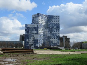 Hoge, compacte gebouwen, al dan niet getooid met namen van beroemde geleerden. Studenten zitten op werkplekken achter ramen. De zon schijnt, de wind waait langs de plinten van de gebouwen. De Hortus Botanicus is kleinschalig, anders dan anders op de Uithof. Het lijkt er op dat er groot onderhoud wordt gepleegd. Vele perken zijn in staat van groeibegin. Naast de Hortus liggen sportvelden, waar meer mensen bezig zijn dan in de Hortus. Een hardlooptraject is aangelegd over het terrein. Ik loop over een recht stuk asfalt, met start en finish na 200 meter. Ik steek de Leuvenlaan over (een klein eerbetoon aan onze zuiderburen met de eeuwenoude universiteit in Leuven), een busbaan, een regenboogfietspad, de Cambridgelaan (een klein eerbetoon aan de vele fietsers in deze Engelse stad). Dan kom ik op de Zandlaan, of er in Zand ooit een universiteit heeft gestaan weet ik niet. Aan het water langs het Hoge Bospad neem ik een pauze, achter mij wandelen studenten en aanverwante personen. Schapen grazen aan de overzijde van het water. Vossegatsedijk brengt mij bij de Kromme Rijn. Langs deze kronkelende Kromme Rijn ga ik terug naar waar ik begon.