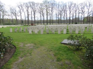 Ik zet koers naar een plek waar op een heel andere manier wordt geleefd en gewerkt. Sportcentrum Papendal. Ik volg het spoor langs de dodenakker en verder de bossen in. Ik ontmoet een zwarte hond die mij aandachtig aankijkt en tevens de oude man achter hem in de gaten houdt. Wanneer ik dichterbij kom ontstaat er een voozichtige kwispel aan de achterzijnde van de hond. De man draagt het tuig(je) van de hond in zijn ene hand. In zijn andere hand heeft hij een roodwitte stok waarmee hij het pad aftast. We hebben een korte ontmoeting. Ever verderop blijkt dat wij drieën liepen over het Gerard Nijboerpad (het pad is beduidend korter dan 42,195 kilometer). Ik treeft binnen op de sportfasciliteiten van Papendal. Hie maken zich gereed voor de werreldtop. De BMX-baan blinkt in de voorzichtige zon, nog een paar dagen en dan wordt hier een Wereldbekerwedstrijd verreden. Tijdens mijn wandeling zie ik weinig mensen en de mensen die ik zie, zitten meestal in een aiuto. Ik zie heel veel auto’s op het terrein. Aan de zijde van de Edese golfclub Papendal gaat ik van het terrein af. Ik begeef mij hier op de Sportlaan, die mij met een haakse bocht brengt naar de Dreijerseweg, die ik oversteek. Aan die overzijde ga ik de bossen van Landgoed Lichtenbeek in. Op een bankje drink ik thee en eet ik een sinasappel. Drie wandelaars passeren mij,. Zij zijn vertrokken van Arnhem en zijn op weg naar Maarheze (tenzij de regen hen overvalt). Ten zuiden van het landgoed tref ik de Airborne War Cemetery aan en het Nummer T03. Ik ben op bekend terrein. Langs de Van Limburg Stirumweg (en een minibieb) ga ik naar het station. Knooppunt S62 staat er nog steeds, wachtend op wandelaars.