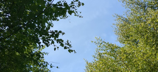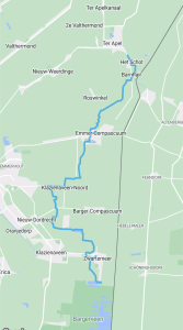 “Dat heeft u wel verdiend.” zegt de man tegen mij terwijl hij langs loopt naar zijn beschadigde werkbus. Ik zit op een stenen balustrade voor de SPAR in Zwartemeer, met een zojuist gekocht literpak. Ik ben net naar buiten gekomen. Binnen kocht ik eten voor vanavond en extra drinken voor morgen. En een appel voor morgen. “U heeft uw appel binnen laten liggen” zei een andere man op een eerder moment. En hij liep door naar zijn auto. Toen ik weer naar buiten kwam met mijn appel reed hij met weg. Ik drink een liter zuivel, met een smaakje, zonder vet. Mijn ongemeten vochtgehalte wil ik op vijzelen voor dat ik de laatste fase van mijn wandeling inga. Eerst teruglopen naar de route en dan door een hoek van het Bargerveen. Mijn pad door het veen is rustig. Dan kom ik een grote stevige man met ontbloot bovenlijf tegen. Hij wordt vergezeld door een flinke hond die goed onder appèl over het brede graspad loopt. De man groet mij en vraagt naar mijn wandeling. Ik vertel over het Noaberpad. Waar kom je vandaan? Vanmorgen ben ik in Ter Apel begonnen. Dan heeft u een flinke tocht achter de rug. Hij wijst mij de weg die ik moet gaan. Groetend nemen wij afscheid van elkaar.