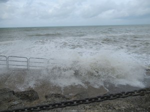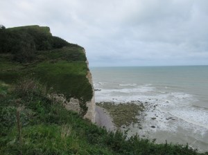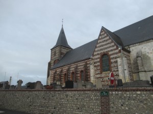 Boven komen wij weer door akkerlanden, we zien een bunker, een restant van de Atlantikwall. In Normandië is de Tweede Wereldoorlog nooit ver weg. Langs de noordzijde van het dorp passeren wij Ételot. Een boer rijdt met zijn trekker over het land en rijdt mest uit. De noordzijde van het dorp mag zich verheugen in een picknickbank, vlakbij de plaatselijke milieuzone (glasbak en nog een bak). Om de naam van deze wandeling eer aan te doen, passeren wij vakantiehuis Les Wagands. Op de weg is nauwelijks verkeer, geen andere wandelaars. Op een plek treffen wij een restant aan van een poort, die de weg naar gebouwen tussen bomen aanwijst. Hier wandelen wij weer op de GR21. Akkerland rijgt zich aan akkerland. In de verte schemert de zee. Windmolens wekken electriciteit op. Dichtbij de Heilige Petrus bij de haven dalen wij door een bos af naar het dal. We besluiten om van de route af te wijken om te kijken wat er te zien is van de haven: niet veel. Parkeerplaatsen, het is vloed en geen bootje te zien. Het water botst en schuimt. Ik zit op een bankje om het te aanschouwen wanneer een verdwaalde golf zijn kop op steekt en mij begolft. Huizen op de kliffen komen steeds dichterbij de randen van de kliffen te liggen. We zien één huis dat al verlaten en verwaarloosd is. Het wachten is op de instorting van klif en huis. Langs de oude begraafplaats, met oorlogsgraven keren wij huiswaarts.