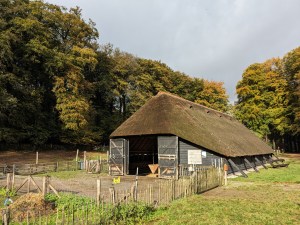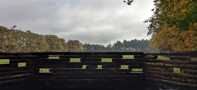 Om het wildscherm van deze wandeling te kunnen bewonderen dienen wij eerst terug te gaan over de Alverschotenseweg. Aan onze rechterhand staat een richtingwijzer die ons attent maakt op het wildscherm, dat wij zonder wijzer ook wel hadden gezien. Het scherm staat vlak langs de weg. Op infobordjes lees ik dat het al lang de wens is van de landeigenaar om een groter wildscherm te plaatsen. Het is een populair punt hier, juist in de bronsttijd. Achter het scherm ligt een grote weide omzoomd door bossen. Een ideale plek om wild waar te nemen. Nu is er geen dier te zien. Het leed hierover is te overzien.