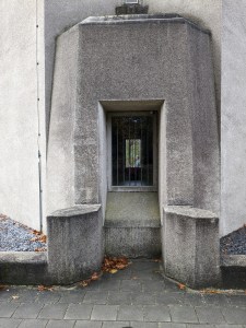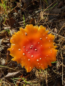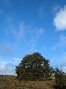 Wij keren terug op onze schreden. Bij het geasfalteerde kruispunt slaan wij rechtsaf en kort daarna nog een keer rechtsaf, een wandelpad. Op de grens van bos en heide volgen wij het smalle pad. Er liggen aan het begin van het pad flinke plassen, maar verderop is er weining plas-dras. Wel contateren wij met tevredenheid dat de zon zich regelmatig laat zien. Wat zich niet laat zien, maar wel laat horen is het geluid van Schietkamp Harskamp. De doffe knallen reiken ver. We leven in een onveilige wereld. Als teken van leven zien wij paddestoelen her en der langs ons pad. Paddestoelen met schutkleuren of met brutaal rood: kijk mij eens staan! Zo gaan wij eerst over de Achterste Steenberg en dan over de … Voorste Steenberg. Op de Veluwe zijj meerdere zandvlaktes. Bij Kootwijk is een grote zandbak, maar op onze tocht treffen een kleine zandvlakte aan: Brummelkamer. We steken een fietspad over en gaan over een zeer smal bospad verder. Aan het einde buigen wij naar links en al snel zien wij in de verte de KATHEDRAAL.