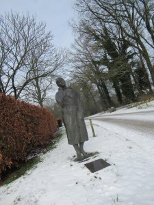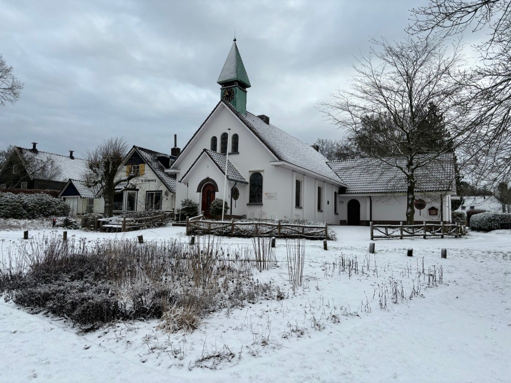 Voor de Hervormde Kapel (zal inmiddels wel ‘Protestantse Kapel‘ zijn) is vanmorgen een auto weggereden, die zijn sporen heeft nagelaten. De Kapel is in trek bij trouwlustige lieden. Restaurants in het dorp kunnen zorgen voor een natje en een droogje, voor de dienst en na de dienst. Oude ooms en tantes kunnen na afloop een balletje slaan op de plaatselijke golfbaan. Nu is er ruimte voor sneeuwballen.