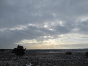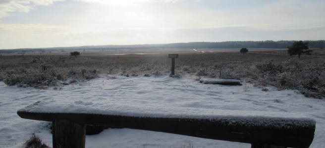 Achter het voormalige jachthuis van koning-stadhouder Willem III (ja, die van Mary) gaan wij een onverharde en naamloze weg in. Links en rechts staan een paar huizen, die de tand des tijds trotseren. De weg snijdt het golfterrein in tweeën, links en rechts wordt er niet geslagen. Rust heerst alom. Door het klaphek betreden wij het Kroondomein, dat na 25 december weer open is voor niet-royale bezoekers. Even voorbij het klaphek volgen wij een smal pad waaromheen zich een beukenbos heeft gevormd. Het pad brengt ons bij de Asselsche Heide. Langs de heide bevinden zich aan de bosrand twee plekken om wild te observeren. Tweemaal een eenvoudige en besneeuwde houten bank. Tweemaal mooi uitzicht over de heide die zich lager bevindt dan de bosrand. Sporen van een auto zijn te vinden op het pad. Sporen van wandelaars cirkelen om de bank. We kijken in de verte . Even laat de zon zich zien en werpt sluiers in het wolkendek. Niets lijkt te bewegen voor ons. We nemen afscheid van de nog steeds besneeuwde bank en gaan verder. In de buurt van de Dassenberg gaan we het bos in. Westelijk van ons is een rustgebied en dit gebied is in diepe rust. Een enkele vogel vliegt van hot naar her. Is er hier nog voedsel te vinden?