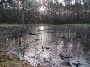 Aan de Vijfsprongweg zijn wij begonnen aan onze wandeling door een draaihek door te gaan. We stuiten onmiddel;ijk op een groot bord dat ons laat lezen dat wij voor de Wildobservatiepost nog ongeveer 200 meter een pad dienen te vervolgen. De pijl wijst naar rechts. Wij gaan naar rechts. We tellen de meters niet wanneer wij op pad gaan. Een andere pijl wijst ons wederom naar rechts, het smalle pad wenkt ons. Wij komen uit bij de wildobservatiepost. Dit is een sjieke post. Er is een ingang en een uitgang. Er is echter draaideur noch vloerverwarming. De breed opgestelde post geeft via kijkgaten op verschillende hoogten zicht op een iets lager gelegen terrein. Op het terrein is zelfs een poel aanwezig. Een paar bankjes kunnen het bezoek aan de post veraangenamen. Wat echter ontbreekt aan de post is wild om te observeren. We begrijpen dat wij zowel te laat als te vroeg aanwezig zijn op deze plek. We zien nog wel een roofvogel van boom naar boom gaan, maar valt er op deze plek te roven?