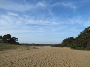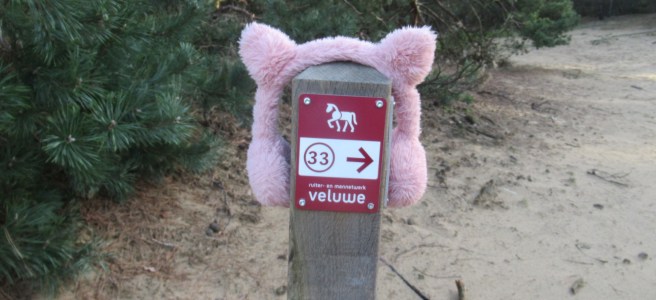 Wij verlaten de wildobservatiepost via de uitgang. Er volgt voor ons een smal en grillig pad. Rechts van ons is een rustgebied voor dieren. De dieren rusten nadrukkelijk. Er valt geen dier te zien. Toch dienen zij hier te zijn. Hier op het Wekeromse Zand en in het Wekeromse Bos. In allerhande informatiebronnen en zelfs in de wandelgids staat het vermeld. We hebben vroeger wel eens koeien gezien, grazend en wel. Van het smalle en slingerende pad komen wij op een breder pad dat wij aflopen. Aan het einde dienen wij linksaf te gaan, maar we lopen even rechtdoor bij poelen, een vlakte en meerdere bankjes. Wij kiezen het bankje in de zon uit en laten onze blik her- en derwaarst gaan. Onder de bank liggen sinasappelschillen, achtergelaten door een vermoeide wandelaar die niet meer de energie had om de schillen op te rapen en mee te nemen op de barre tocht door het zand. Wij gaan verder tot ook wij bij het zand uitkomen. We volgen de paaltjes die ons de belofte doen van ‘nummer 40’, dat ergens verderop ligt. Zolang wij de richting van het nummer volgen kunnen wij veilig de zandvlakte oversteken. Temidden van mul zand worden wij ingehaald door een jonge vrouw. Zij heeft zich goed voorbereid op deze tocht. In haar rechterhand heeft zij een flesje water. Even verderop zitten een moeder en een klein kind aan de rand van het zand. Op een paal van de ruiterroute hangen oorwarmers. Er loopt nu een paard rond met koude oren.