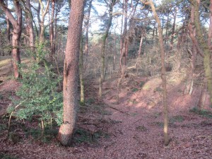 Wij verlaten het zand en komen op een bospad, uiteindelijk komen wij zelfs bij slagbomen en parkeerterreinen. Hier zouden wij het Wekeromse Zand kunnen verlaten, maar dat doen wij niet. We slaan bij de tweede slagboom linksaf en na een korte wijle gaan wij wederom linksaf in een opgaande beweging. We zijn nu aangekomen op de stuifwal, die in aloude tijden het stuifzand moest tegenhouden, zodat de akkers niet ondergezand werden. Handwerk van het degelijke soort, beplant met bomen. Over de top van de stuifwal loopt een smal pad. Links gaat het naar beneden, soms wel acht meter. Rechts gaat het naar beneden, soms wel zeven meter. De stuifwal is geen rechte streep in het landschap, dewal slingert en stijgt en daalt en is voorzien van boomwortels en bladeren, die hier hun laatste adem hebben uitgeblazen. We volgen de hoogte van de stuifwal en kruisen paden. Of we nog steeds op de route wandelen is niet duidelijk, maar we gaan vrolijk voort. ‘Heb je die boom met meerdere stammen gezien?‘, vraagt Wandellief. ‘En al die boomwortels?‘ Ik ben mij van geen kwaad bewust. Waarschijnlijk heb ik, struikelend over de boomwortels, de andere kant uitgekeken. Of waren mijn gedachten geheel ergens anders.Het kan zo maar gebeuren. We komen aan het einde van de stuifwal en dalen af en kruipen tussen de takken van een omgevallen boom door. Die takken zie ik wel.