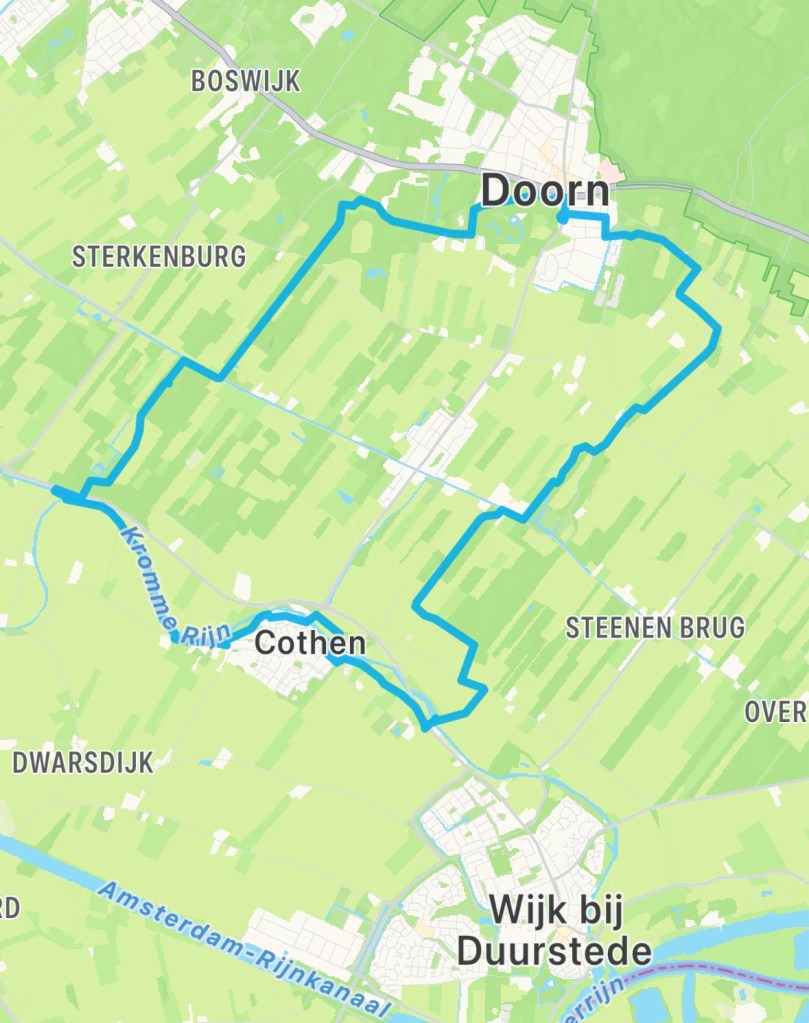 Warm is anders, maar het is wel droog op dit bankje. Een paar watervogels varen heen en weer op het water. Achter mij is een boomgaard. Na roggebrood en thee ga ik verder langs de boomgaard, dan te noorden van de boomgaard (Landscheidingsweg) en vervolgens naar het noorden, door het groen tot ik stuit op een pad, dan ik naar links volg, een laan die uitloopt op grasvelden en modderpaden, langs een oude schuur en dan een lange lijn naar het noorden. Ik kom uit op de Langbroekerwetering (brede enveloppe?). Even naar het oosten, met zicht op Kasteel Walenburg. Voordat ik bij Kasteel Sandenburg kom sla ik af naar het noorden door een smal bosperceel, waar ik twee dames tegenkom. Veel wandelaars tref ik vandaag niet. Hier ben ik in Gerrit Achterbergland, want hij groeide hier op toen zijn vader koetsier was op landgoed Sandenburg. Regelmatig kom ik onderweg gedichten van Gerrit tegen, want ik volg het spoor van het Klompenpad Gerrit Achterbergpad (zover is Simon Vestdijk nooit gekomen, zover ik weet). Het pad brengt brengt mij steeds noordelijker, ik steek de Gooyerwetering over. Verder naar het noorden. Achter boerderij Postenburg ontmoet ik een overstroomde beek, zodat ik het struikgewas inga. Gelukkig ben ik niet de eerste die hier een zijspoor is gevolgd. Over lanen en tussen landerijen ga ik verder en ik kom op de Buurtweg, dit zal wel betekenen dat ik in de buurt van Doorn ben. Nog wat bebouwing en ik ben waar ik was.