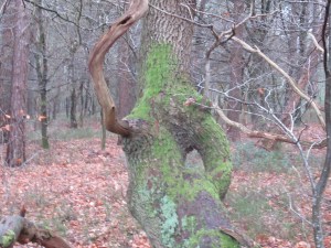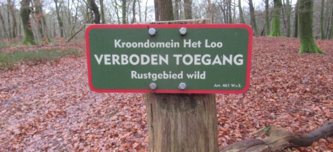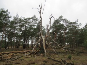 Een gevallen boom moet zichzelf maar zien te redden. Wij zien er vele. Her en der in verregaande staat van ontbinding. Niemand die helpt. Ons pauzemoment zit er op. Ik pak mijn rugzak in en slinger het geval om mijn schouders. Dan komen van de richting Aardhuisweg twee wandelaars, een man en een vrouw, een broer en een zus (ook van elkaar), in volledige wandeluitrusting. Wij raken aan de praat. Zij zijn op hun wekelijkse wandeling over de Veluwe. De zus draagt een éénogige kijker, het is een warmtekijker, waarmee zij zonder te zien toch kan waarnemen. De warmte die een dier (verscholen of niet) uitstraalt vangt zij op met haar kijkbuis. De broer vertelt over hun wandelingen en dat hij ook met zijn meissie aan de wandel gaat. Het plan is om het Westerborkpad te gaan wandelen. Dat is een indrukwekkend pad in het spoor van de jodenvervolging. Na ons gesprek gaan zij verder over de Hofweg. Wij vervolgen onze weg op de grens van heide (hier wel een beetje) en het Meervelderbosch. In de buurt van de Langeberg gaan wij naar het zuiden. De varens onder de hoge bomen wachten op betere tijden. Een man komt ons tegemoet lopen. Hij groet ons met een goede middag. Hij is al de vierde wandelaar die wij op deze wandeling tegenkomen. Verder langs de de Duvelsdel. Dan lopen we al op de Hofweg, waar wij de eenzame wandelaar nog een keer ontmoeten. Er steekt geen zwijn op hoffelijke wijze de weg over, zelfs geen edelhert of hinde.
